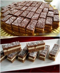 Kolač se potom ostavi u frižideru da se dobro ohladi i stegne – idealno preko noći. Nakon toga se seče na kocke ili štangle, po želji. Eto ga to je t kolač je spreman za serviranje, nadam se da će vam se svidjeti. Uživajte u fenomenalnom ukusu i javite kako va se svidio.